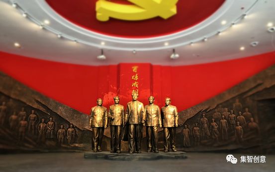 序厅,淬火成钢,永葆本色。展标墙以“百炼成钢”为设计关键词,中心挺立毛泽东、刘少奇、任弼时、贺龙、彭德怀的人物雕像,四周环绕热血湖湘儿女的背景浮雕,顶部党徽高照、群星围绕,结合多媒体特效打造烈火铸钢、气势磅礴的空间氛围,突出湖湘典型红色资源和湖湘党性精神。