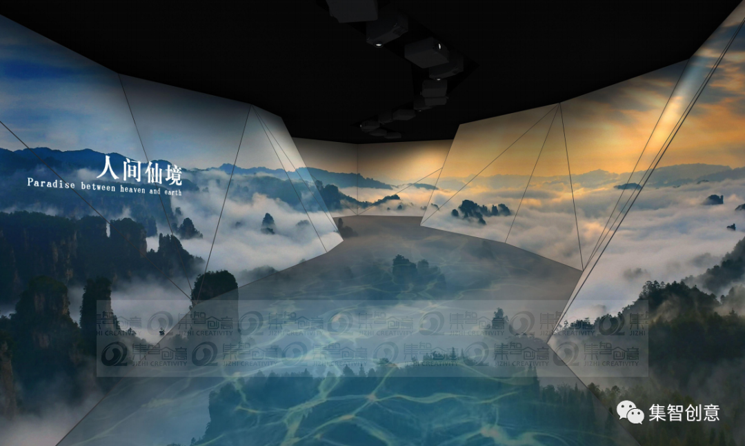 展览馆以“仙境张家界”为主题,通过精巧的空间设计,多元化、高科技的交互多媒体技术,打造一个沉浸式光影漫游空间,以艺术、自然、风土、风采等为内容剧幕,开启张家界的旅行序曲。