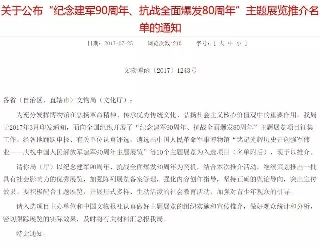 近日,国家文物局公布了“纪念建军90周年、抗战全面爆发80周年”主题展览项目征集结果,共选出10个展...